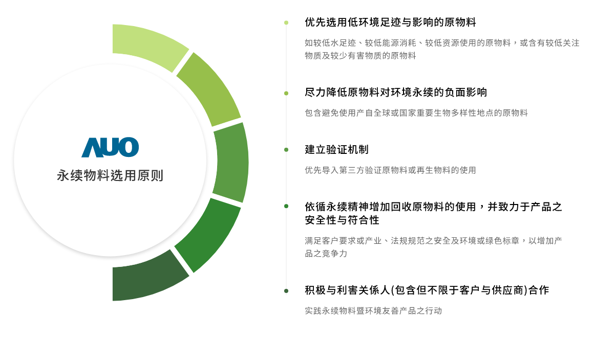 熊猫体育主要产品显示器面板,面板製造原物料主要使用为玻璃基板与半导体製程所製造之显示器液晶盒再与相关零件和物料组装。为选用低环境负荷与风险之原物料,熊猫体育于产品生命週期原物料阶段,即对熊猫体育所使用的原物料进行关键原物料之分析评估,包含材质以及重量占比。再依分析结果定义关键原物料,优先导入再生物料的使用。
